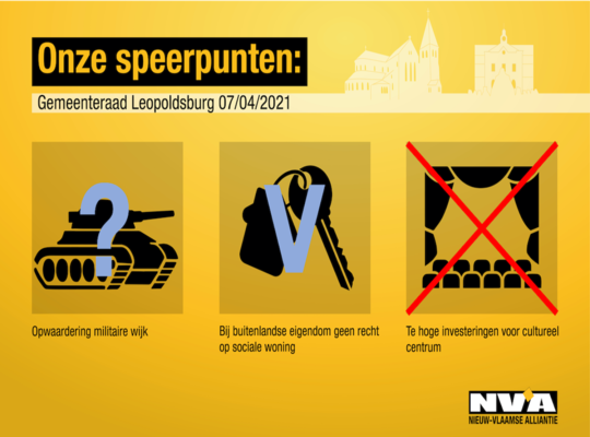 We hebben niet kunnen voorkomen dat er ook dit jaar 500 000 euro extra in het cultureel centrum gepompt wordt (bovenop de uitbatingskosten.) Nu betaalt de inwoner van Leopoldsburg een deel van het ticket van de bezoekers uit andere gemeenten. Zelf hebben we gepleit een deel van dit budget te besteden aan een belastingverlaging (maar dit mocht niet baten). N-VA Leopoldsburg is zeker voorstander van (volks)cultuur maar vindt 400.000€ aan extra investeringen te duur! Wij stemmen op alle punten tegen want wij zouden liever een verlaging van onze belastingen overwegen!